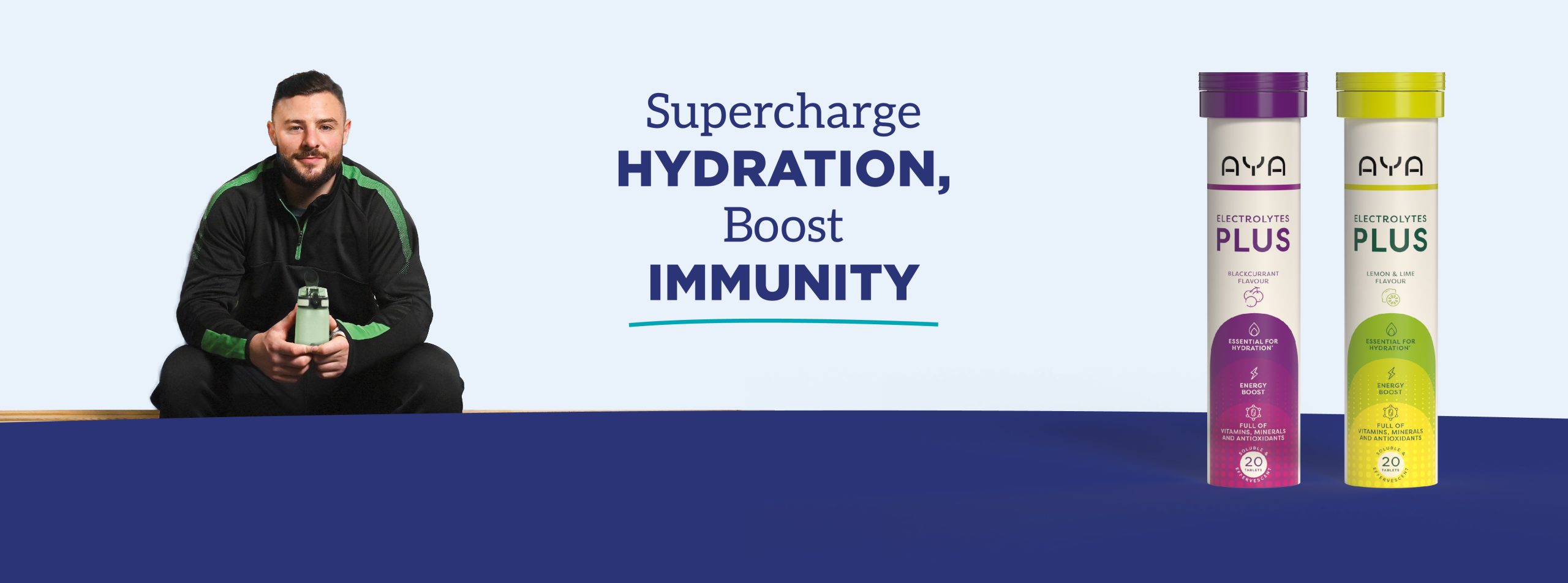 AYA Brand Partner and Irish International rugby player Robbie Henshaw says, ‘’Aya Electrolytes helps me through my busy schedule. It is a potent powerhouse formula with 13 vitamins and minerals. It helps my immunity and general well-being. I also find taking AYA Electrolytes really helps to support the reduction in tiredness and fatigue’’.